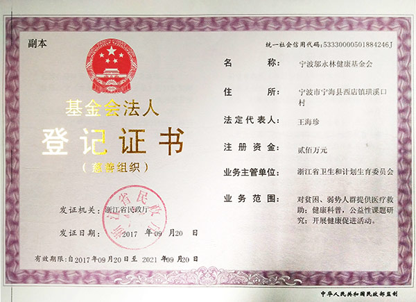 宁波邬永林健康基金会,成立于2010年10月,是在浙江省民政厅注册、由浙江省卫生健康委主管的非公募基金会。基金会的原始基金数额为人民币贰佰万元,来源于时博(中国股份有限公司。《慈善法》颁布后,本基金会被认定为慈善组织。